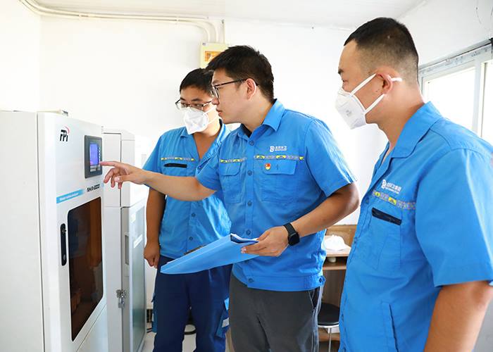 张新龙同志(中)与同事共同检查设备