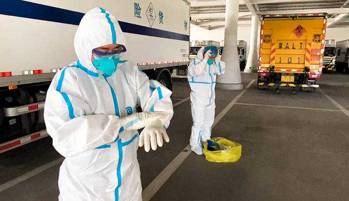 规范穿上防护服、佩戴手套(固废物流公司 任晓云 摄)
