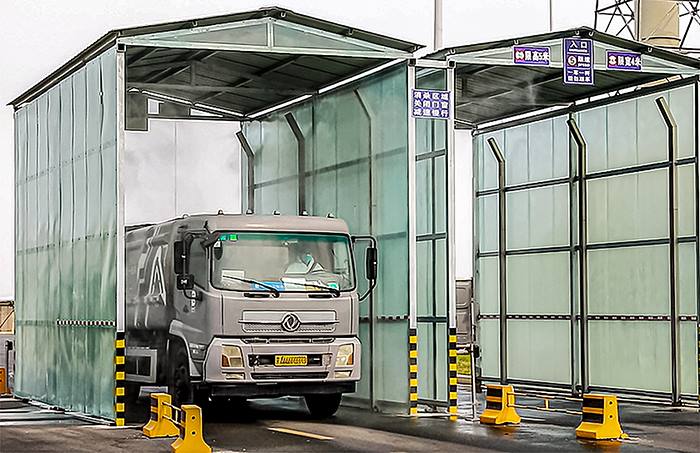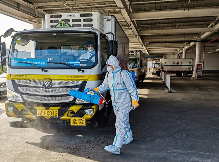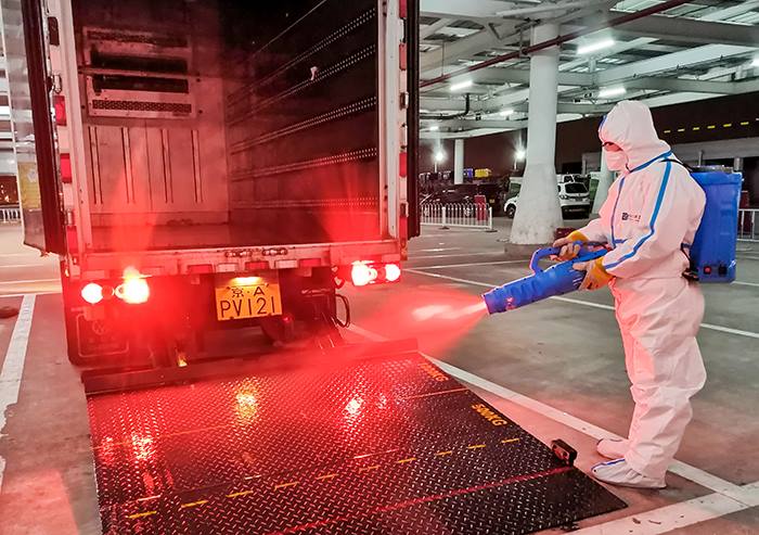 驶出厂区前,作业人员对封闭作业车辆进行消杀(固废物流公司 任晓云 摄)