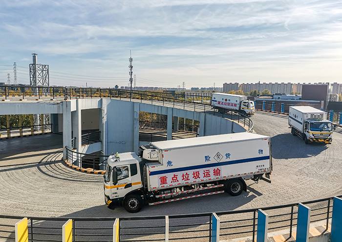 清运重点管控垃圾的作业车辆卸料后驶出厂区,同时进行全面消杀(南宫园区公司 王荣杰 摄)