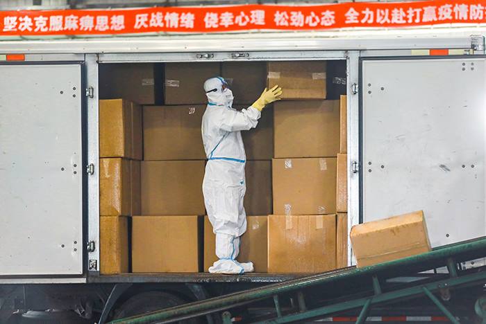 集团所属固废物流公司职工“逆行而上”,领取防护用品,准备出发清运重点管控垃圾(固废物流公司 李彦军 摄)