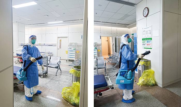 队员们在急诊楼封控区内进行仔细消杀(环服公司 陆勇 摄)