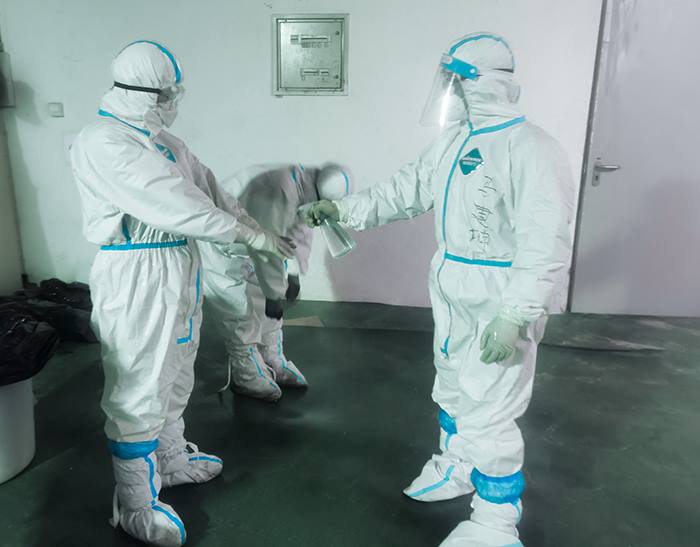 紧张的工作结束后,作业人员进行全面消杀(阿苏卫园区公司供图)