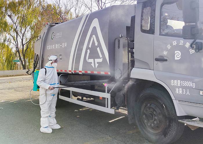 通州走近okpay公司职工为作业车辆消杀(通州走近okpay公司 王晓津 摄)