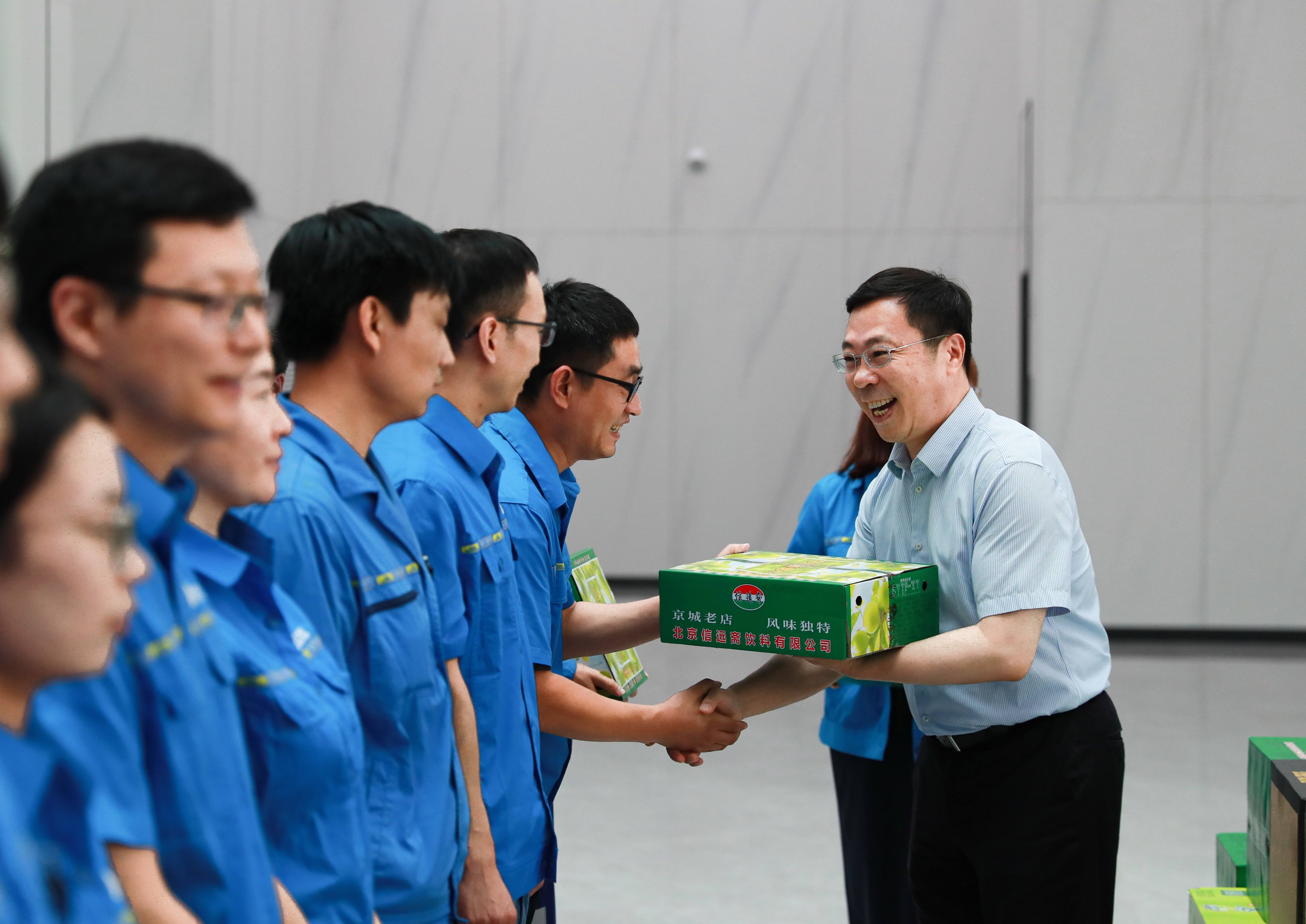 6月21日下午,中华全国总工会副主席、书记处书记、党组成员金善文带队来到北京okpay钱包集团安定园区分公司,开展“送清凉”活动,看望慰问一线okpay钱包职工,并送上防暑降温物品和慰问金。中国海员建设工会全国委员会主席、分党组书记李庆忠,集团党委书记、董事长高踪阳,副总经理刘凯等陪同慰问。