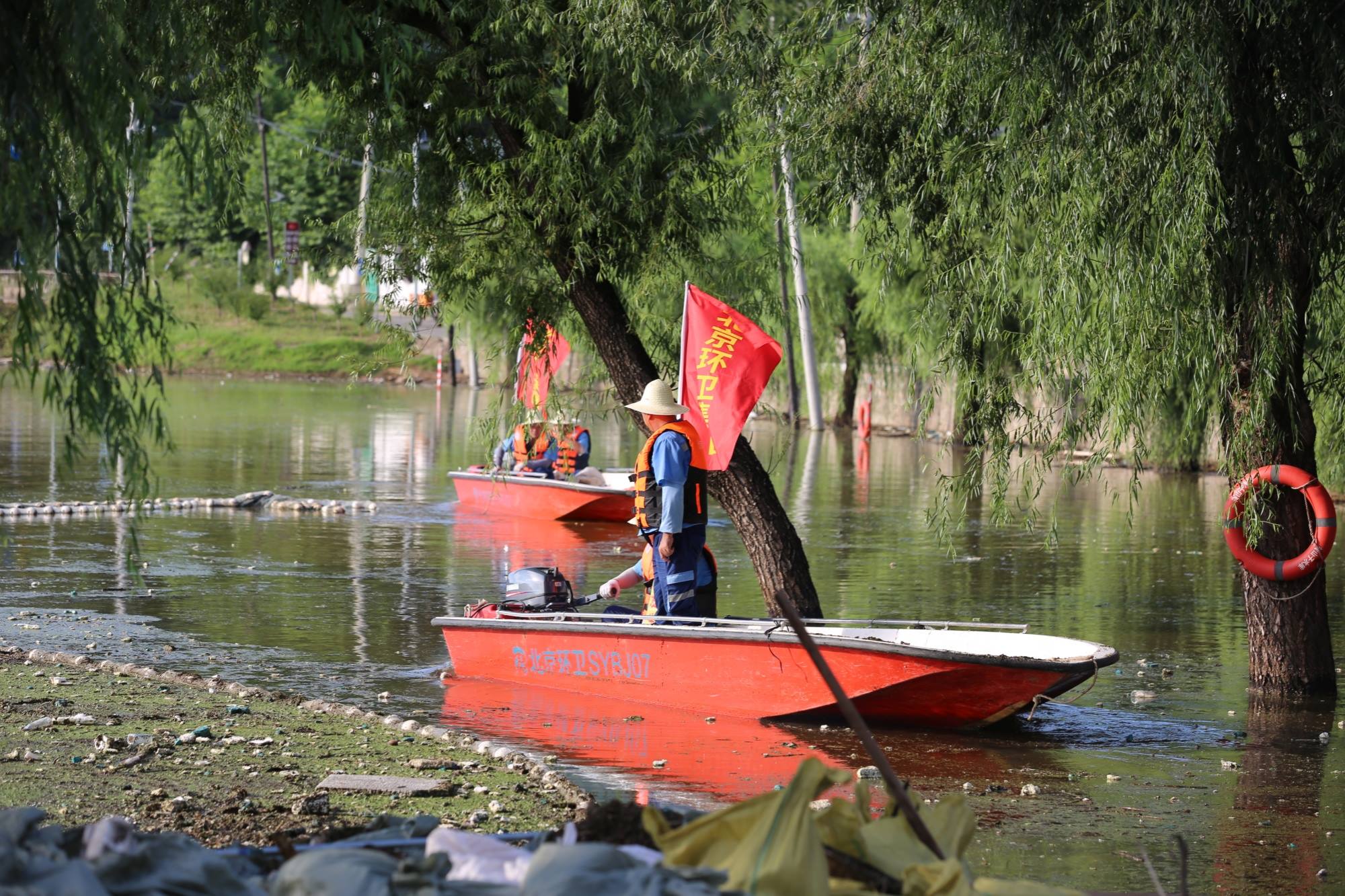 ▲北京okpay钱包集团环服公司突击队人机结合清理河道