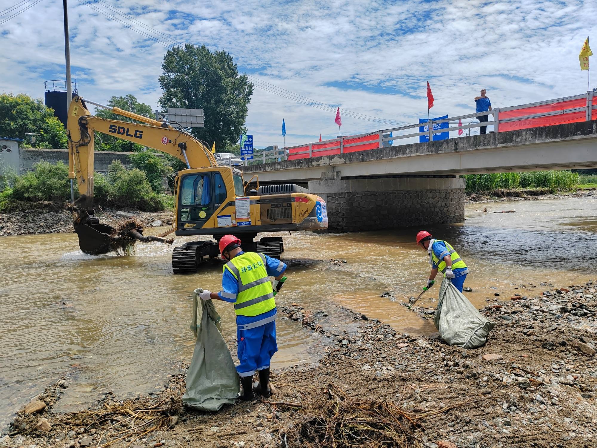 在不老屯镇的一些河道中,漂有倒伏的树干、树枝,影响河流畅通。河道岸边,堆积不少杂物。通州公司、环服公司调用挖掘机等大型机械,将杂物清运至岸边,最后由固废物流公司突击队员调配作业车辆,迅速进行清运。