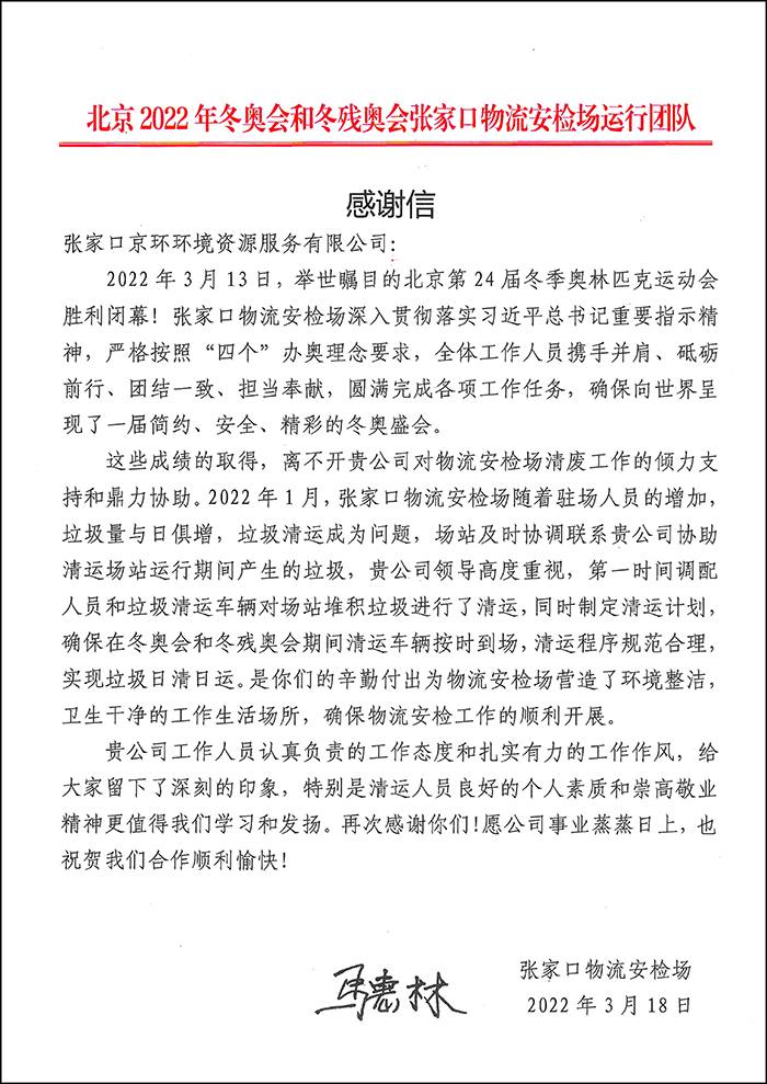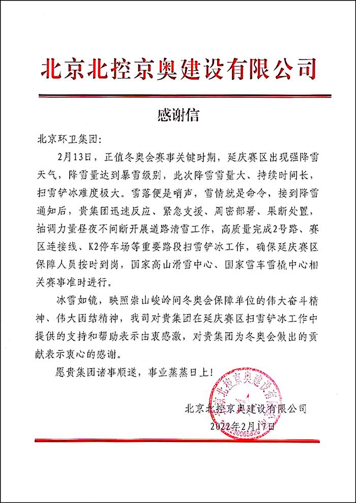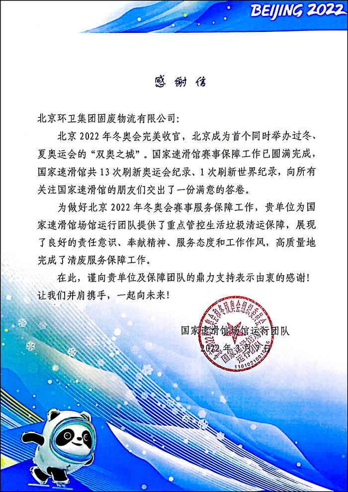 近日,延庆区委区政府、北京冬奥村(冬残奥村)运行团队、国家体育馆场馆运行团队、国家速滑馆场馆运行团队、国家游泳中心场馆运行团队、国家奥林匹克体育中心、北京冬奥会兴奋剂检测中心运行团队、北京北控京奥建设有限公司、张家口物流安检场等单位纷纷发来感谢信,感谢集团及所属单位为冬奥会和冬残奥会的顺利举办所作出的突出贡献!